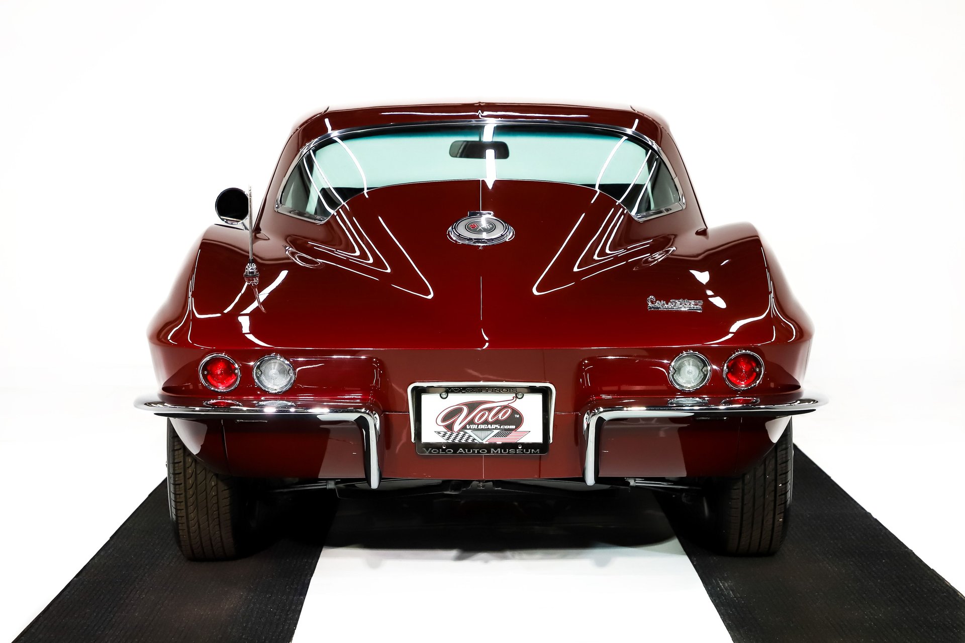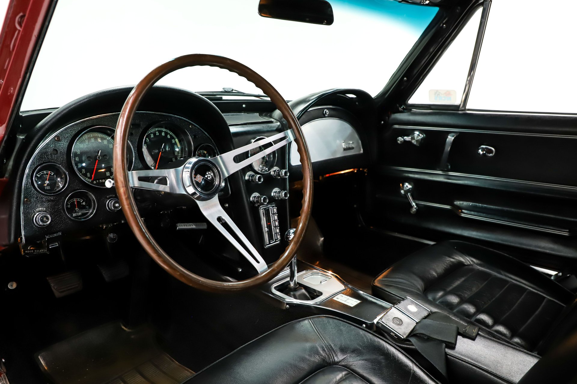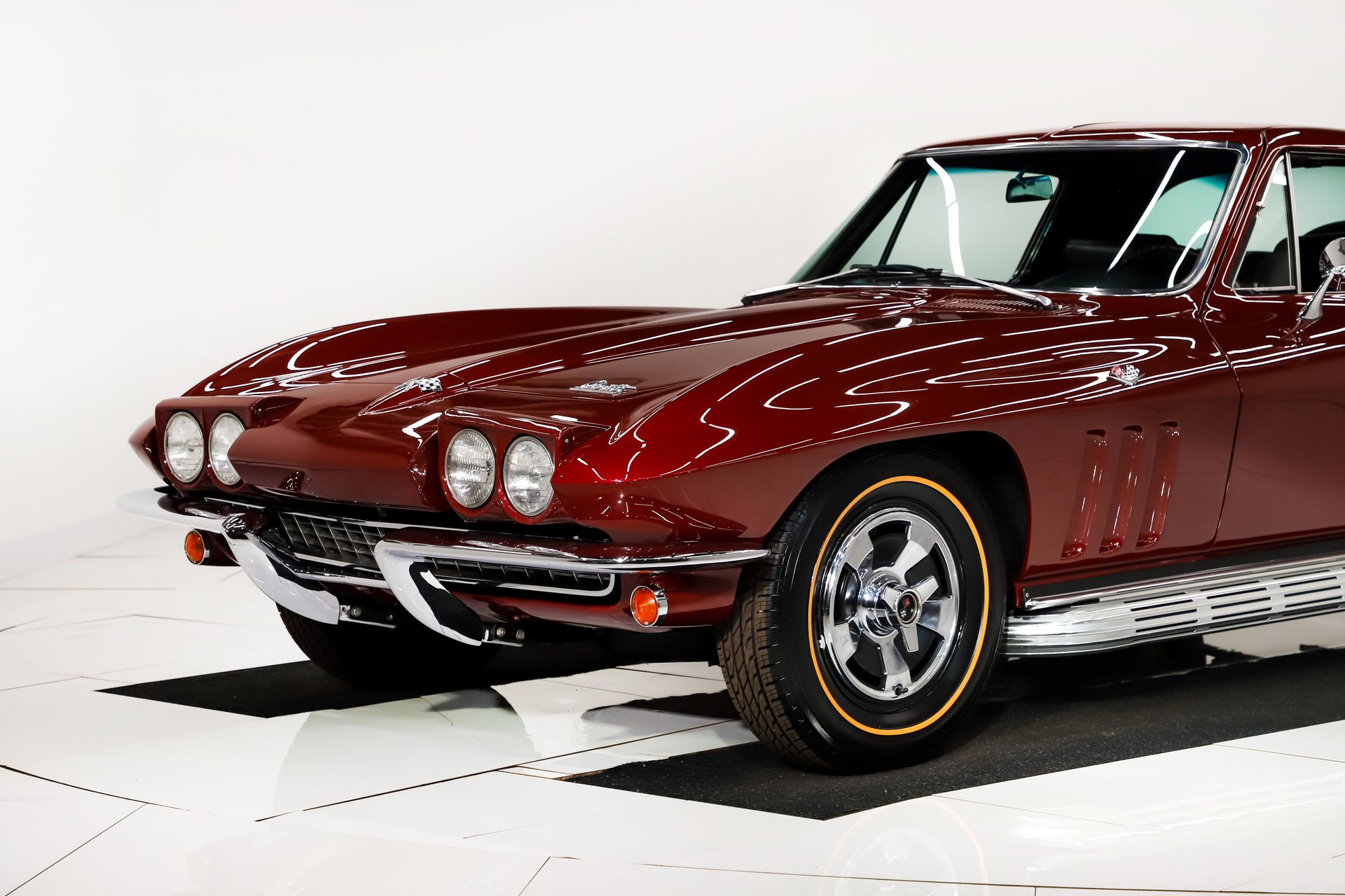 EXTERIOR: Few cars can match the lines of a C2 Corvette coupe, and this example is exceptional. Believed to be a no-hit, all-original body, it shows no signs of damage or stress cracking, and the panel fit is outstanding. The doors shut with a reassuring precision, and the headlights operate exactly as they should. It has been refinished in its original Milano Maroon Metallic, applied evenly and topped with a deep, glossy clear coat. The bumpers have been rechromed, and it retains the correct antenna and bowtie mirror.