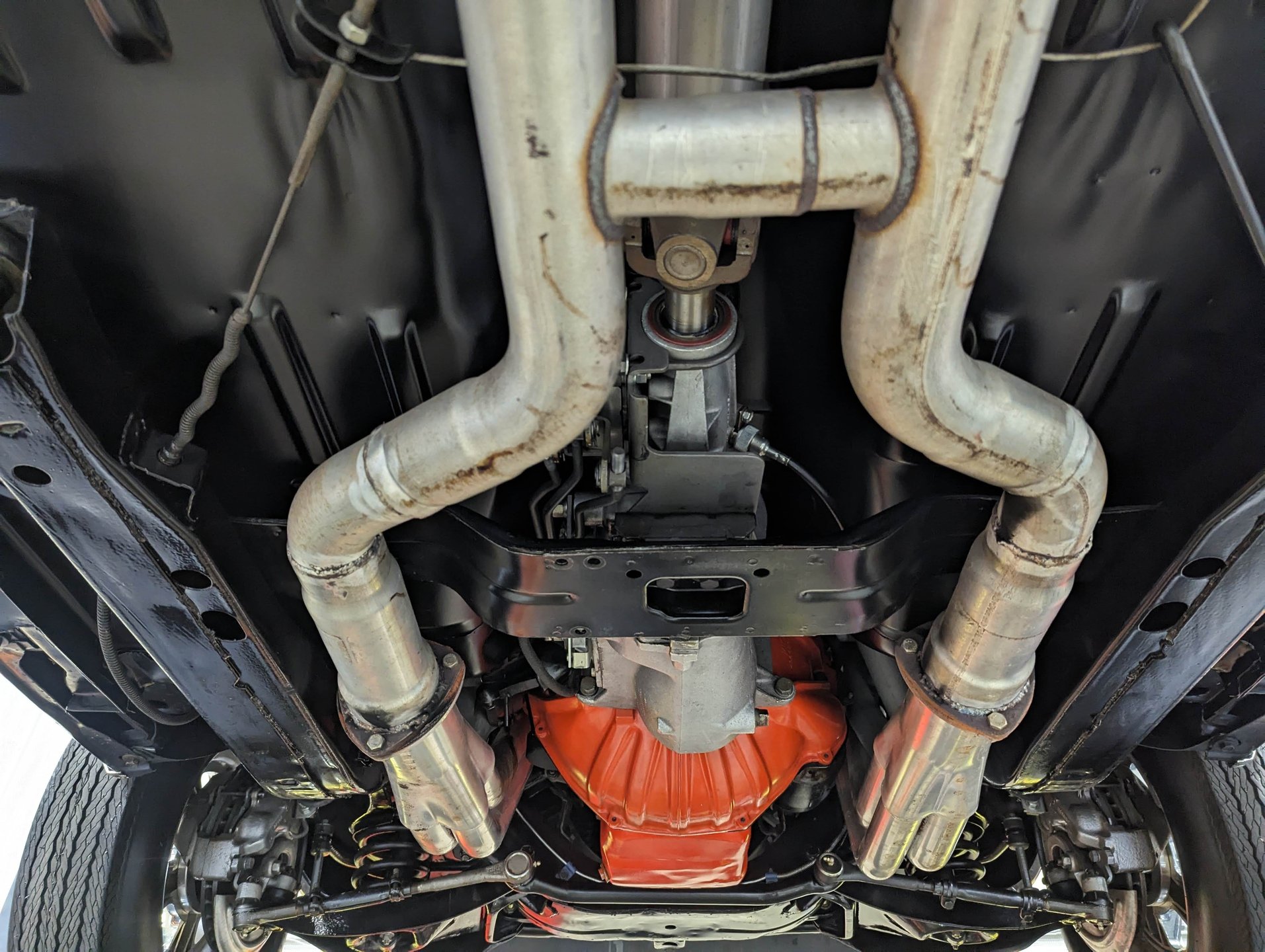 UNDERSIDE: Body off frame restored, every component was removed. Rust free, clean floors were painted a smooth satin black. Everything was put back together with new or rebuilt authentic parts. All the steering and suspension was redone, it even has correct spiral shocks. The entire brake system was redone, disc in front and drum in back. Replaced lines, e-brake cables etc. Fuel system was replaced. It was upgraded with a fatter exhaust, h-pipe and Flowmaster mufflers. Looking up at the motor it's clean Chevy orange with a correct starter. Correct M-22 "rock crusher" Muncie 4-speed with a Hurst linkage. Correct 12 bolt rear with special ordered 4.88 gears! Obviously, gas mileage was not the goal.
