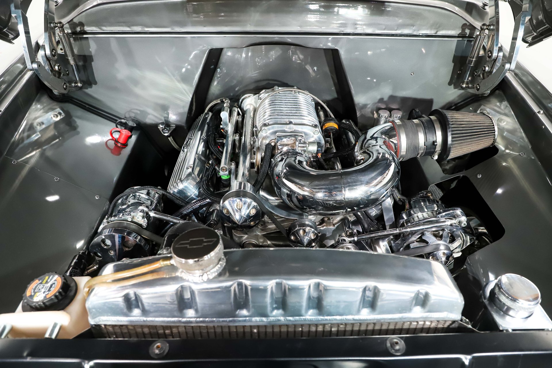 ENGINE COMPARTMENT: Wow, that's impressive! It's loaded with polished parts and yes that's a polished Whipple supercharger sitting on top of the 6.0 Vortec LS engine. It also has polished aluminum heads, polished cold air intake and a set of coated headers. It's also dressed up real nice with some Billet Specialties coil pack covers and the front of the motor has a serpentine belt system with polished pulleys, a/c compressor and alternator. It also has modern power steering with a remote reservoir. A polished aluminum radiator and polished electric fan keeps it running cool. The engine bay is custom fabricated metal that was painted the same body color. A real nice set of EMS billet hinges operates the hood smooth as silk.