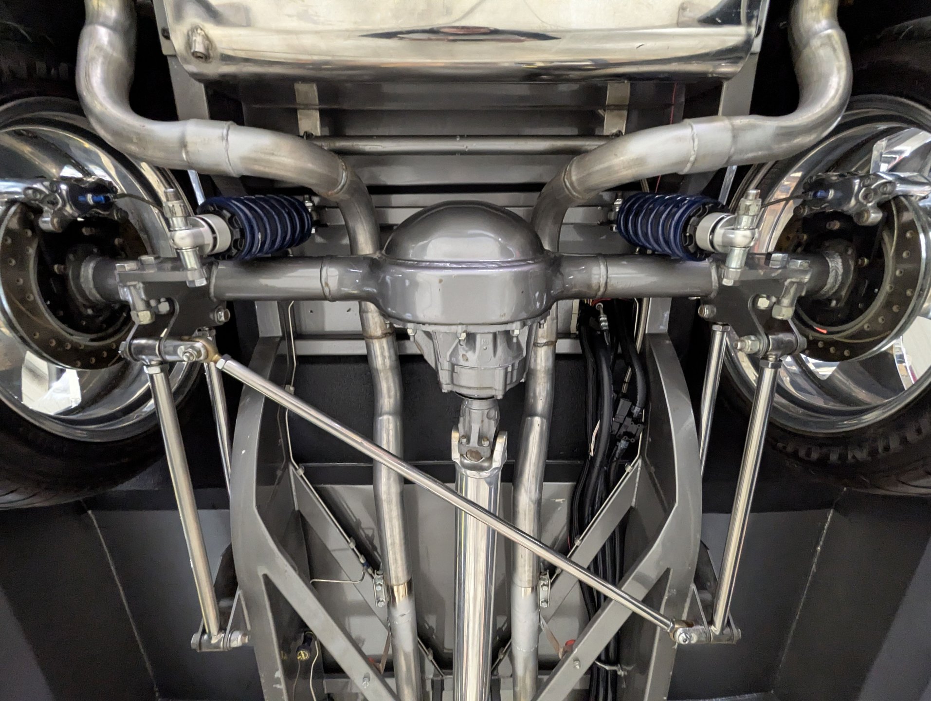 UNDERSIDE: This is sitting on a complete aftermarket custom chassis. The new frame is boxed, smoothed and painted body color. The front end is full of polished parts including tubular upper and lower control arms, drop spindles, tierod ends and swaybar. It has Ridetech coilover adjustable gas shocks, rack and pinion steering. Similar deal in back: a four link system with polished tubular control arms, pan hard bar and Ridetech coilover adjustable gas shocks. The custom made exhaust is sounding great with Flowmaster mufflers. The brake system has a polished master and power booster, Wilwood drilled and slotted discs at all 4 wheels and polished calipers. The fuel tank is polished. Looking up at the motor it has an aluminum oil pan and high torque starter. The trans is a 4L80E overdrive automatic and a polished aluminum driveshaft connects to the 9 inch rear with 3.73 posi gears. There is zero rust under this truck, all the metal was replaced and painted.