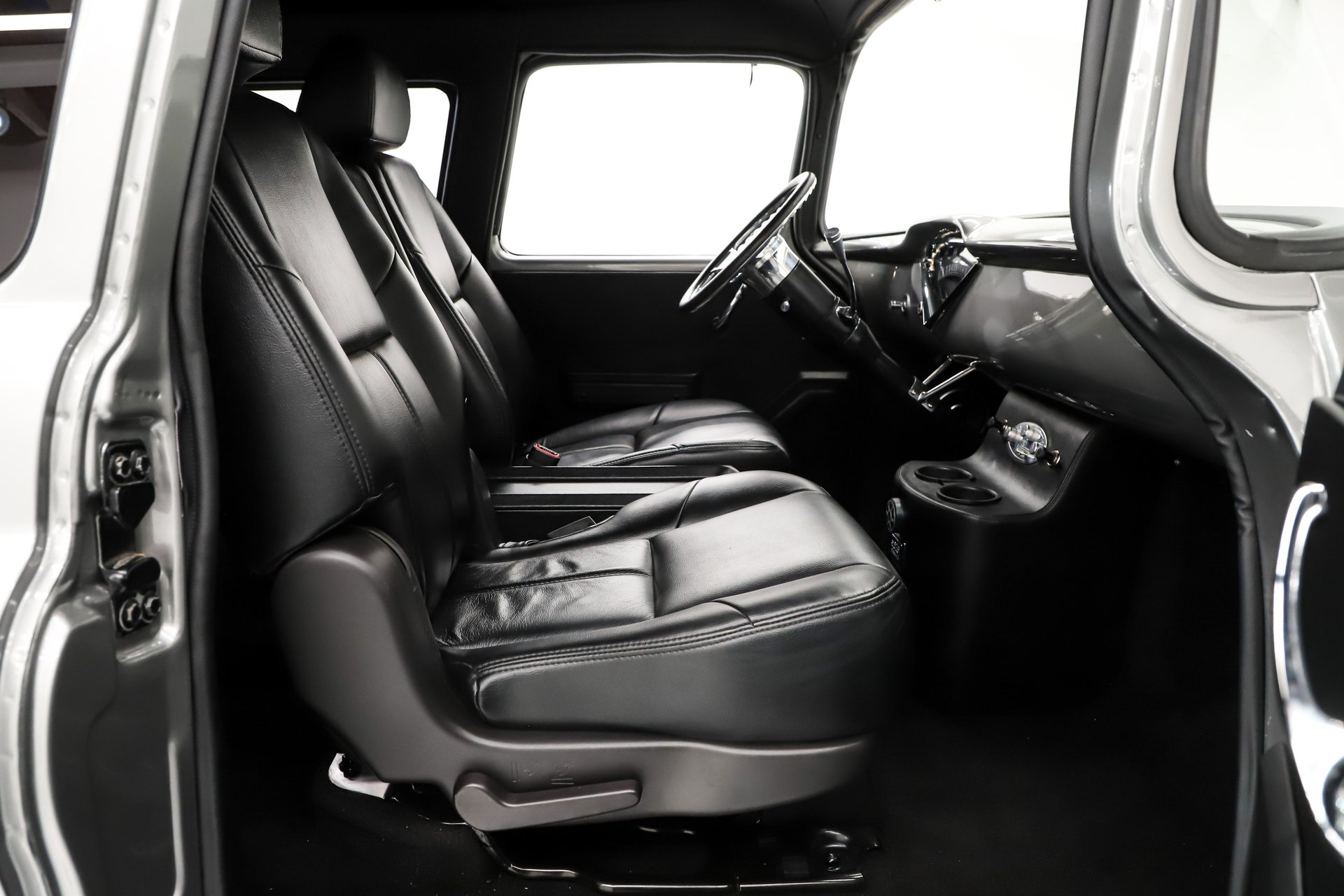 INTERIOR: Very well finished custom leather interior that seats four comfortably. The custom molded side panels, consoles, headliner and moldings are expertly wrapped and stitched throughout with no loose seams or imperfections. Nobody has to fight over who rides upfront, all four leather captain chairs offer the ultimate comfortable seating. Everyone will be able to enjoy the Bluetooth stereo system with multiple speakers, amp and subwoofer. The driver can get positioned just right with the power seat and tilt wheel. I love the Retro gauges! They look stock but are digital and include everything from a tachometer to the shift indicator and only 275 miles showing on the odometer. The dash is cleaned up, smoothed out and painted. The forward console has cupholders, a/c controls and the power window switches. Boy, you are going to be cruising in comfort!
