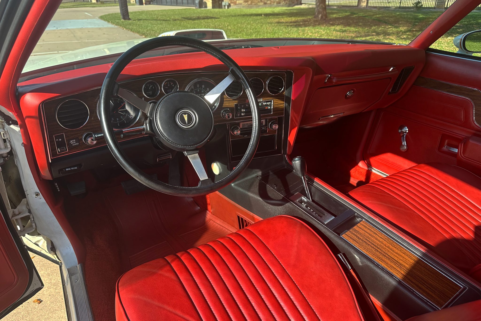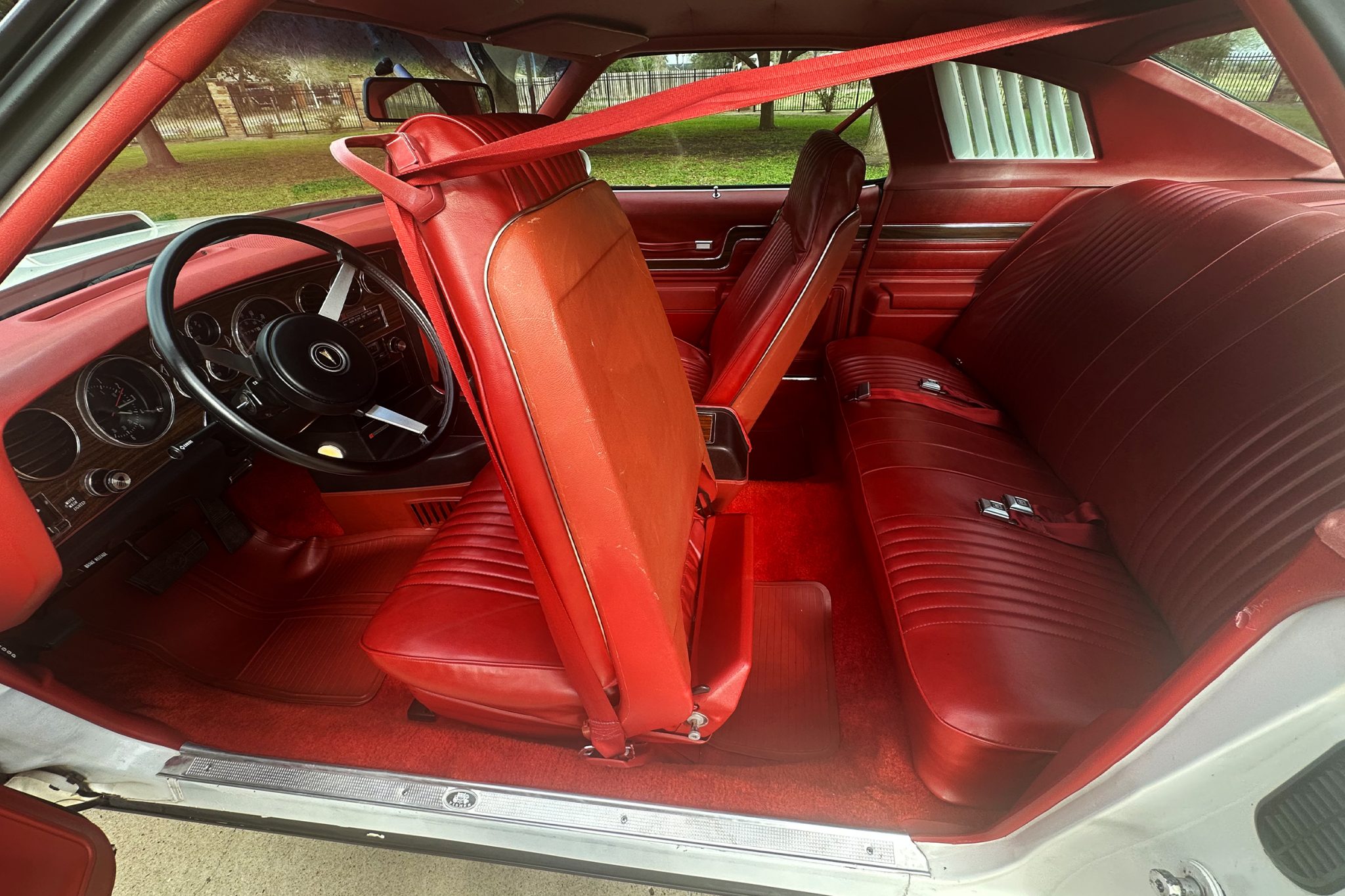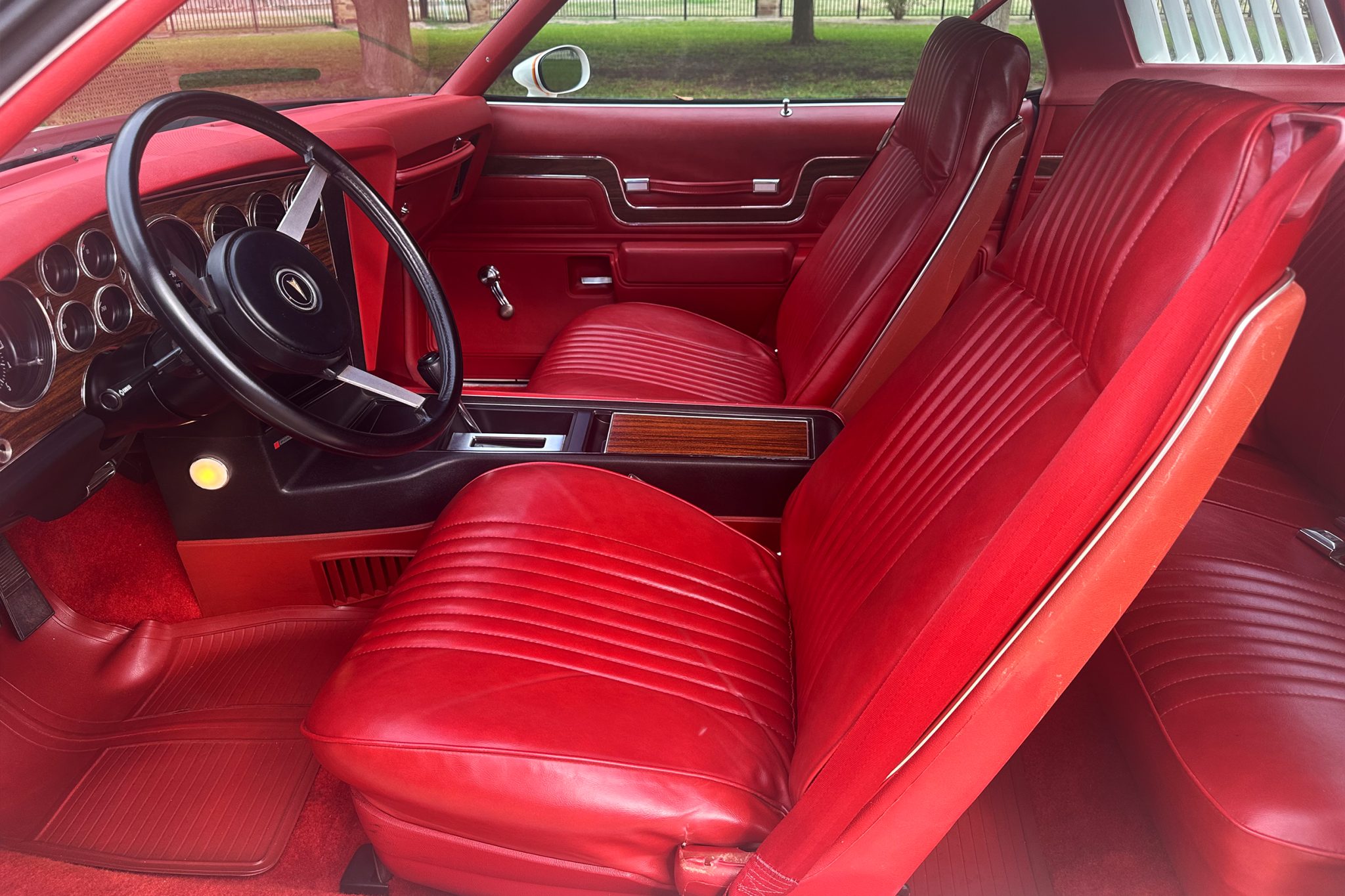 The Can Am package added a Trans Am-sourced 400ci W72 V8, a handling package, accent stripes, a shaker hood, and a rear spoiler. Finished in Cameo White over Firethorn Red vinyl, the car is further equipped with a three-speed automatic transmission, a Safe-T-Track differential, 15″ Rally II wheels, power steering, power-assisted front disc brakes, and cruise control.