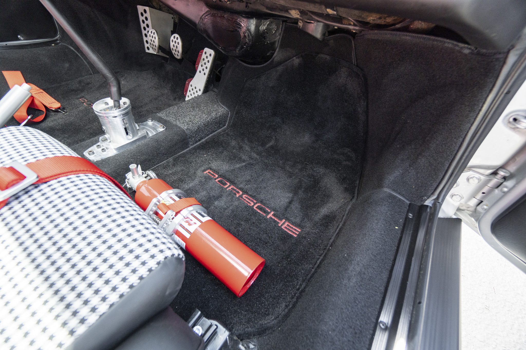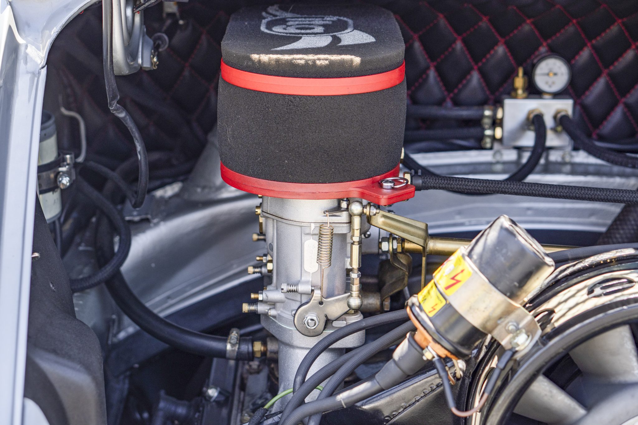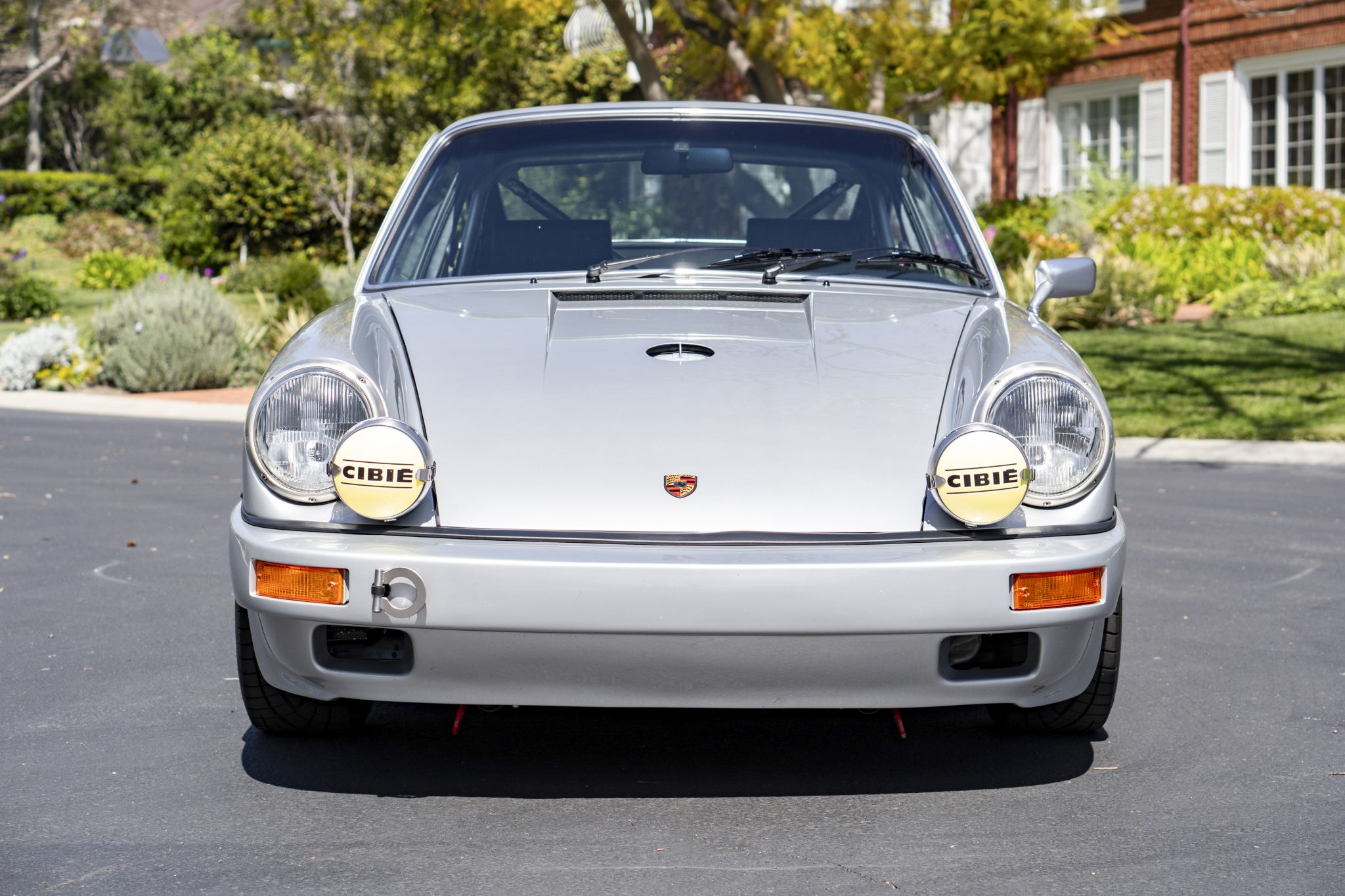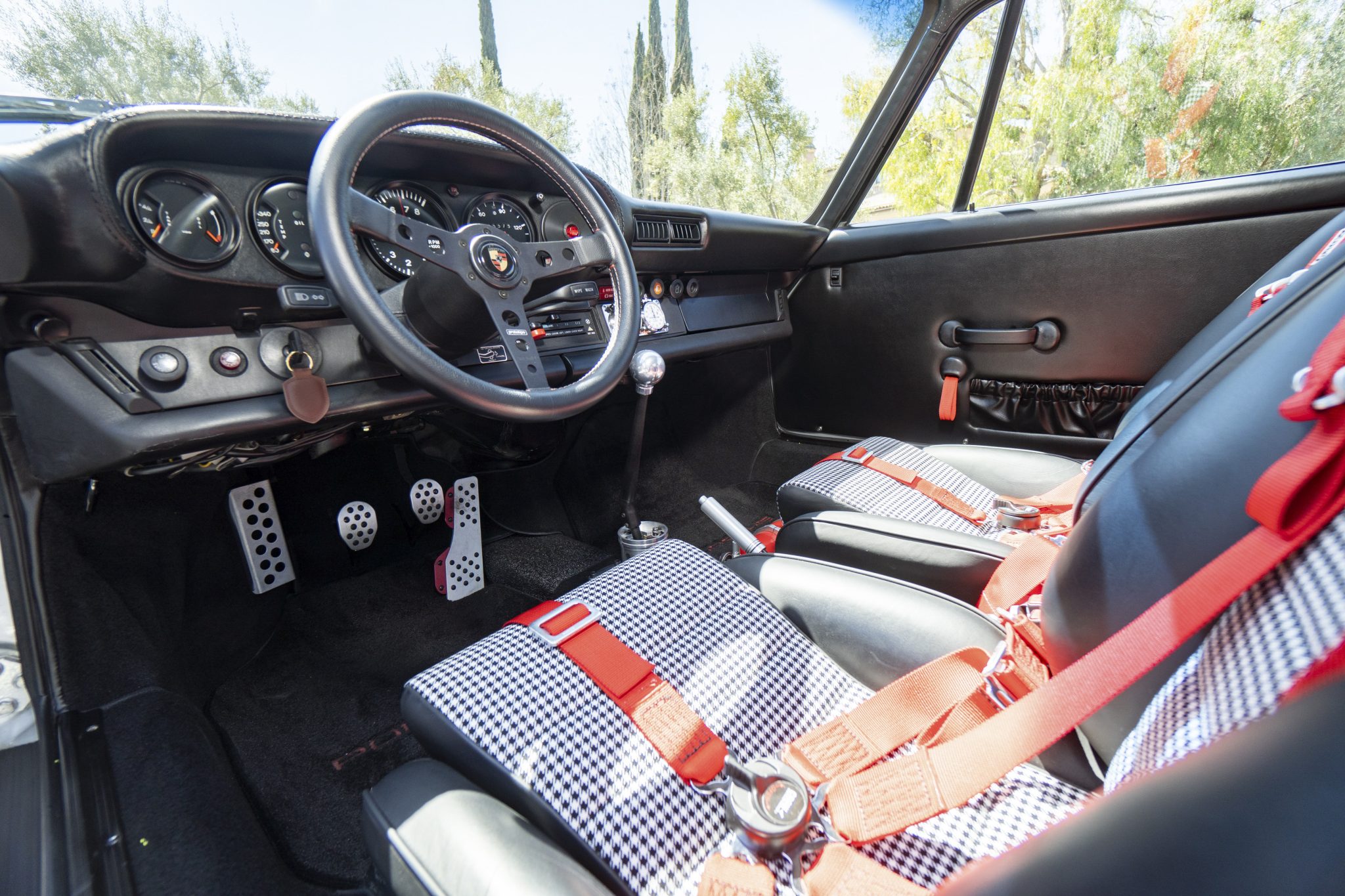 This 1977 Porsche 911S Coupe was modified around 2015 with a 911SC-sourced 3.0L flat-six, dual PMO carburetors, steel rear fender flares, fiberglass bumpers, a repaint in silver, and an overhaul of the interior. The car features a five-speed manual transaxle with short-ratio second, third, and fourth gears along with Bilstein dampers, hollow sway bars, drilled brake rotors, 15” wheels, Cibie driving lights, and red Carrera graphics. On the inside, Classic Touring bucket seats with houndstooth inserts and Crow harnesses are joined by a roll bar, a RennShift shifter, a MOMO steering wheel, Rennline pedals, and dash-mounted Hanhart rally timers