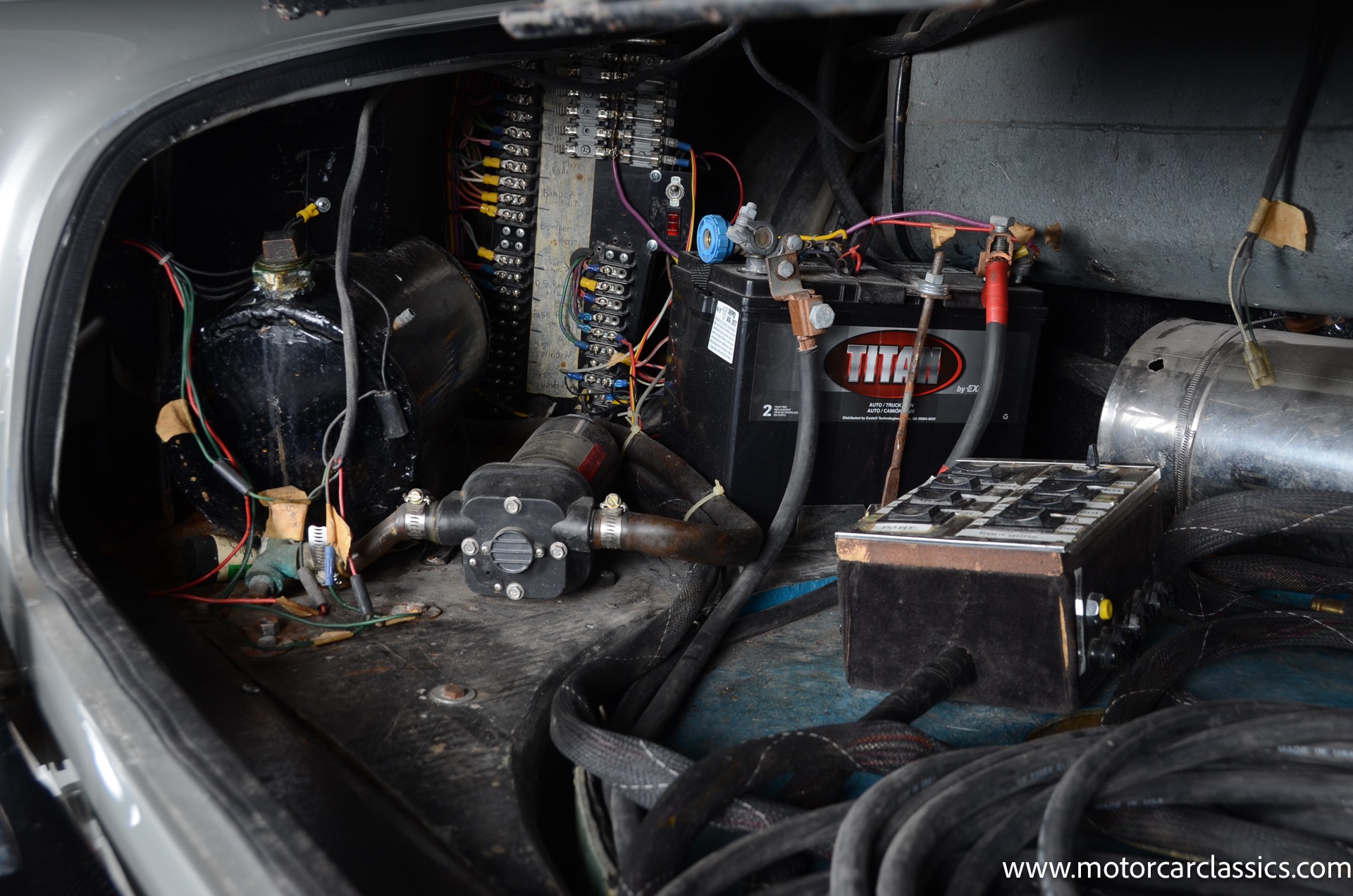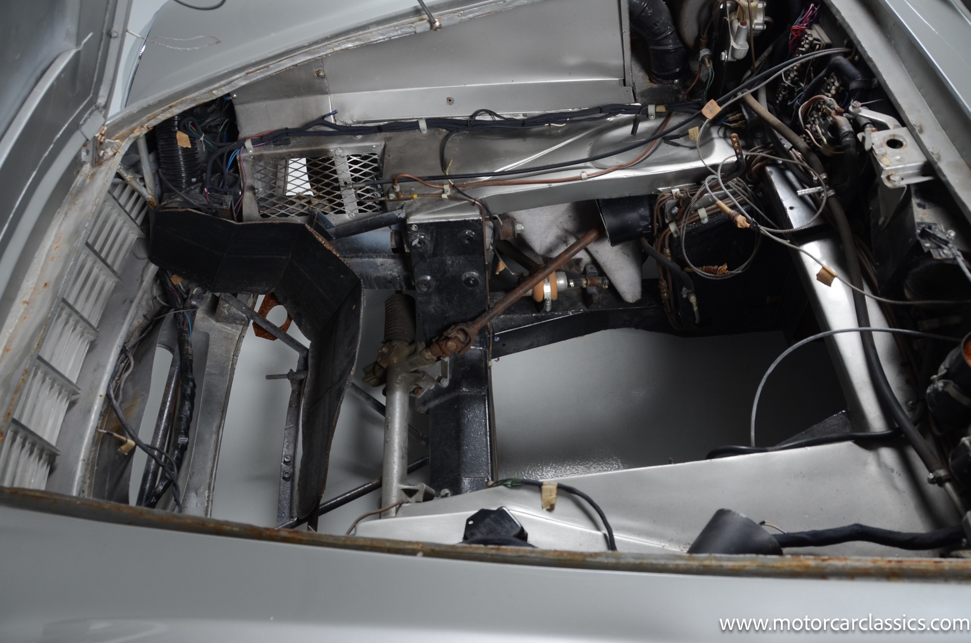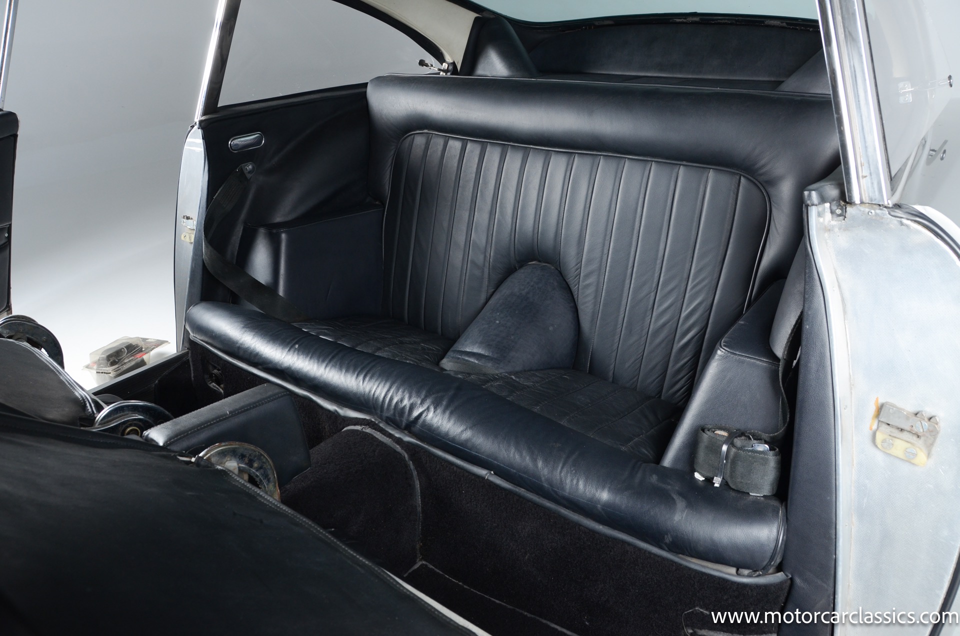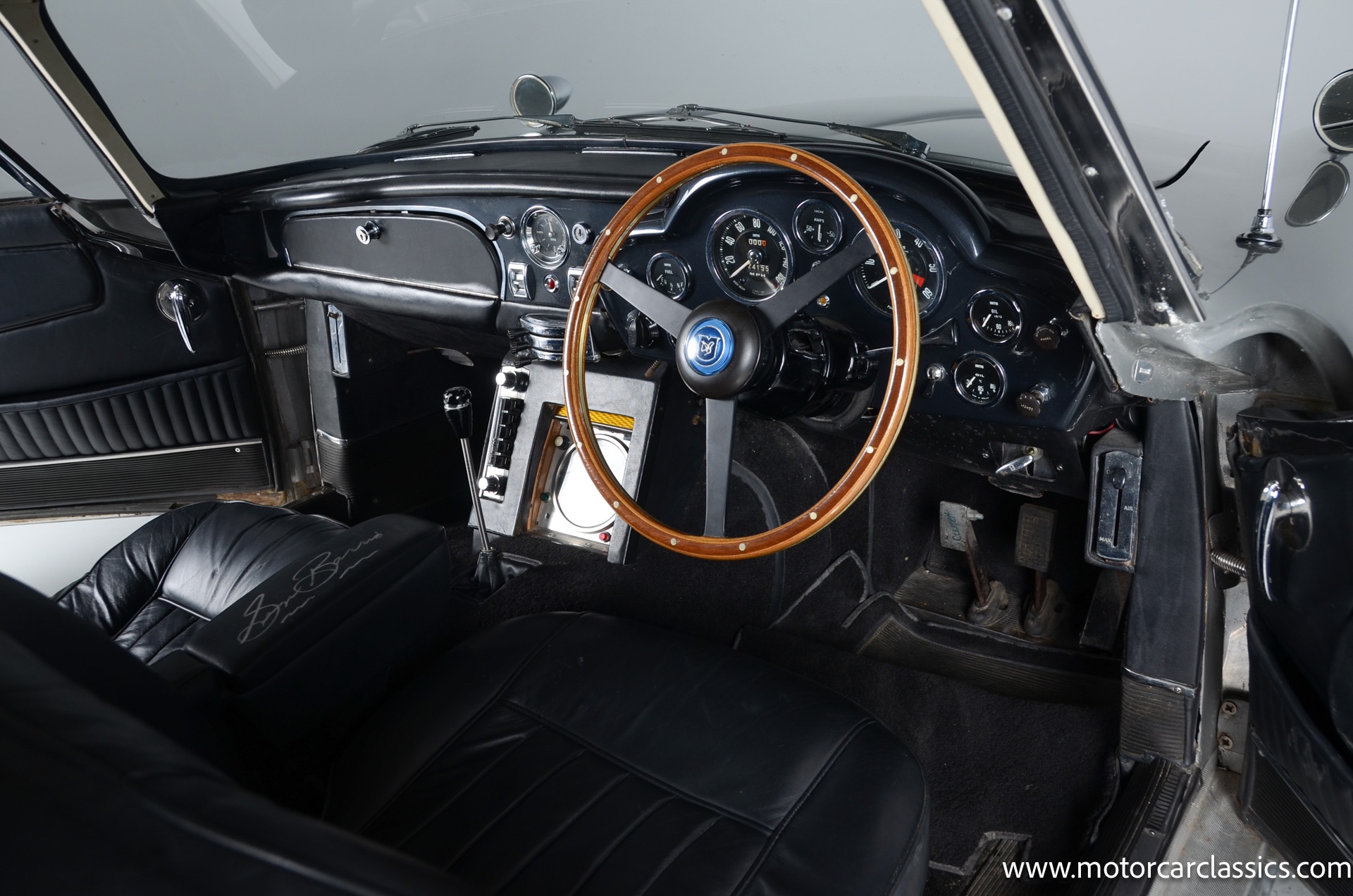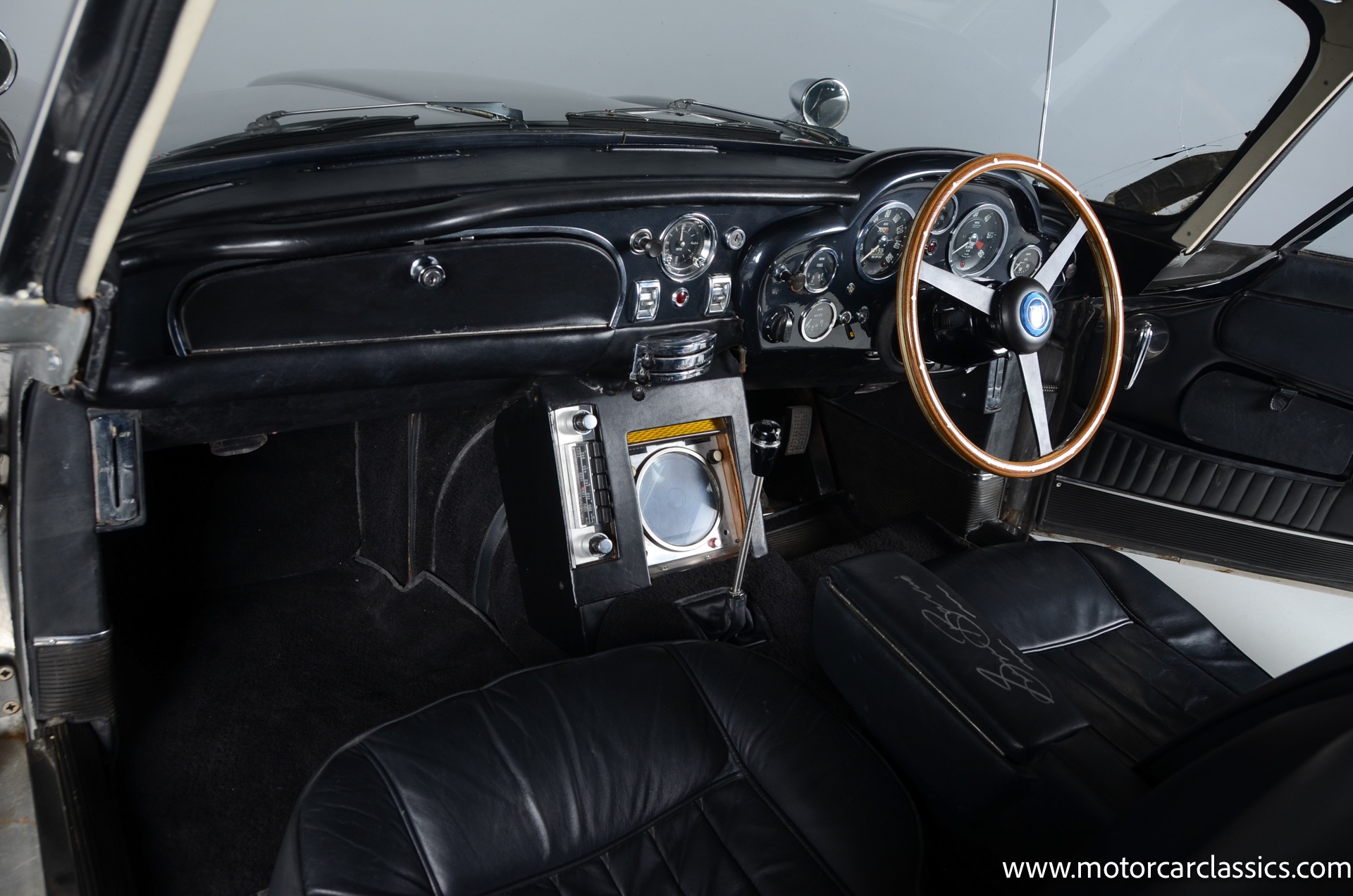 This car was sourced by George Barris' representatives from Connecticut and was supposedly originally owned by Aston Martin as part of their race team. It was originally equipped with a larger and faster DB6 engine which has since been removed from the car. The car does come with the DB6 engine separately however, along with the original transmission and some other parts. The frame, rear end, floor and most of the body and suspension is original. The wheels are not original and are aftermarket wheels from England. The interior was all redone at one point. The Vin number is still stamped on the crossmember. Center console armrest has also been signed by George Barris.