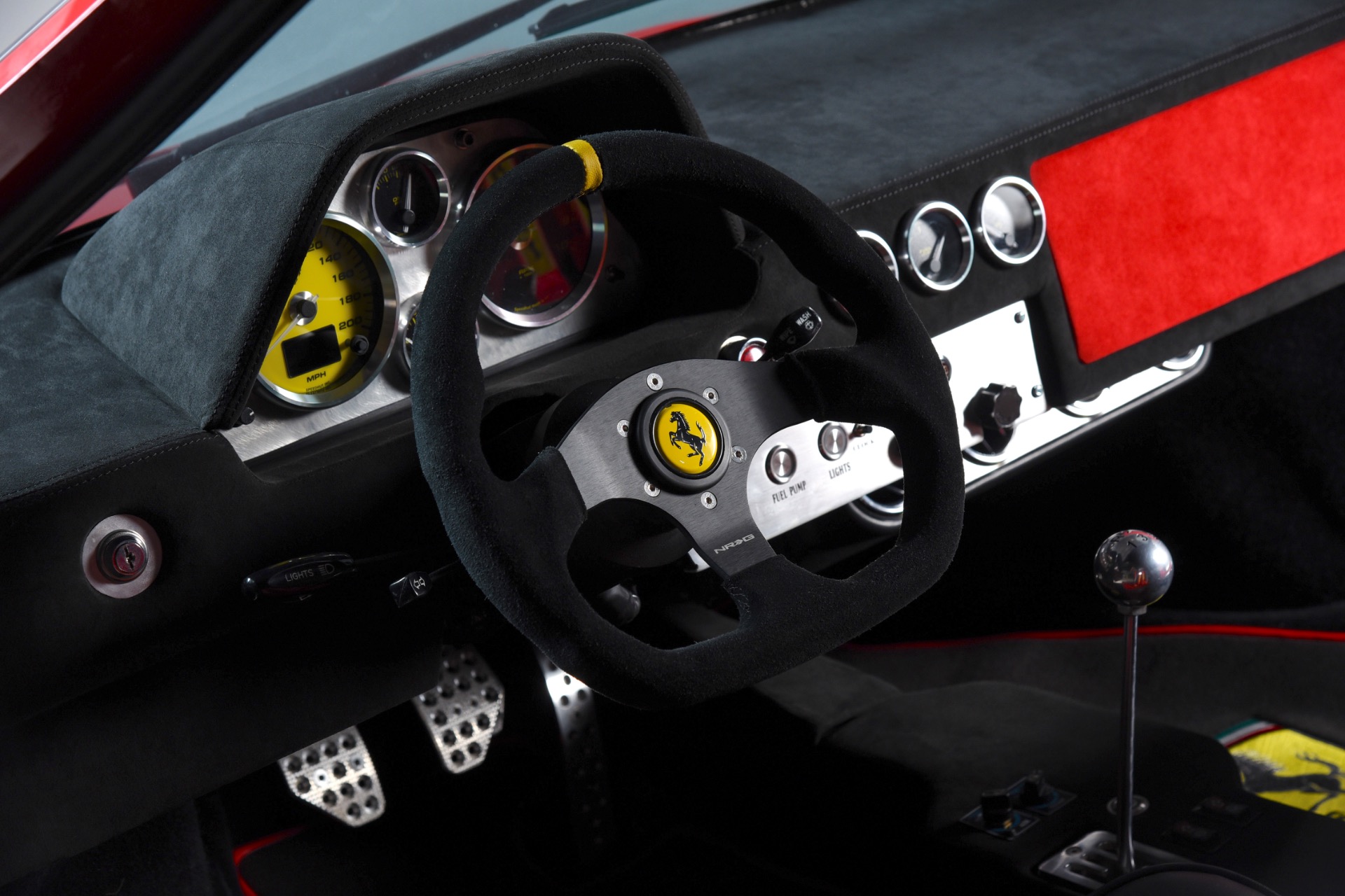 The cabin is a masterclass in 1970s Italian ergonomics, featuring a driver-centric cockpit finished in a sophisticated custom black and red interior with Daytona seats and a custom dashboard. The distinctive "dog-leg" 5-speed gated manual shifter stands prominently as the centerpiece of the driving experience. This 1978 model is equipped with factory air conditioning and power windows, highlighting its status as a grand tourer capable of modern usability.
