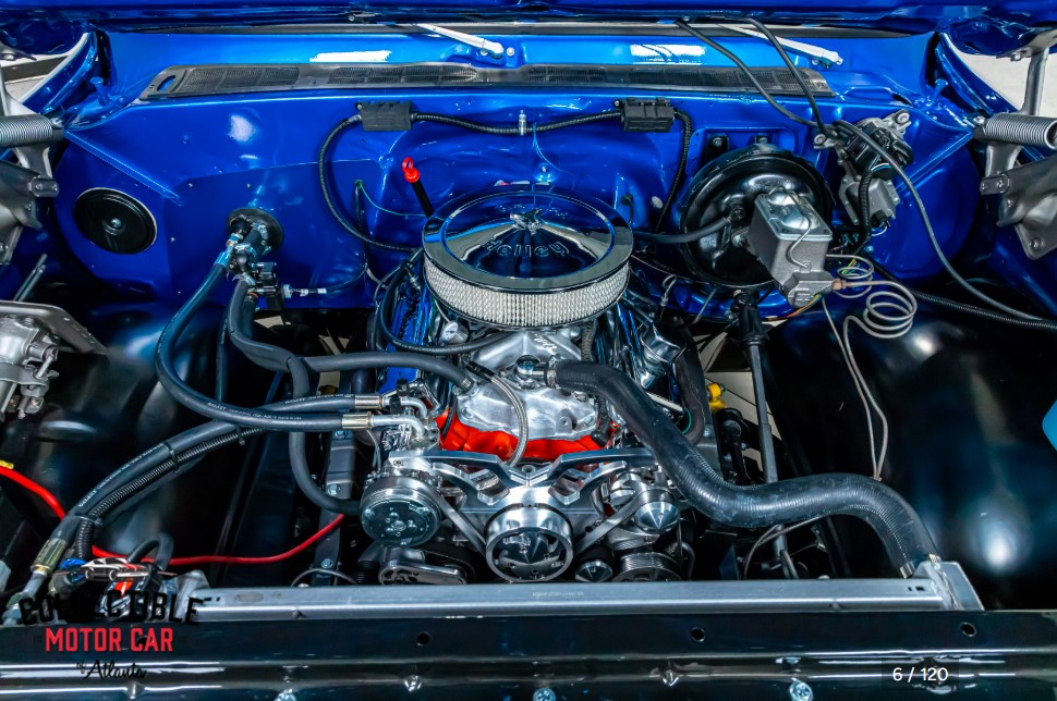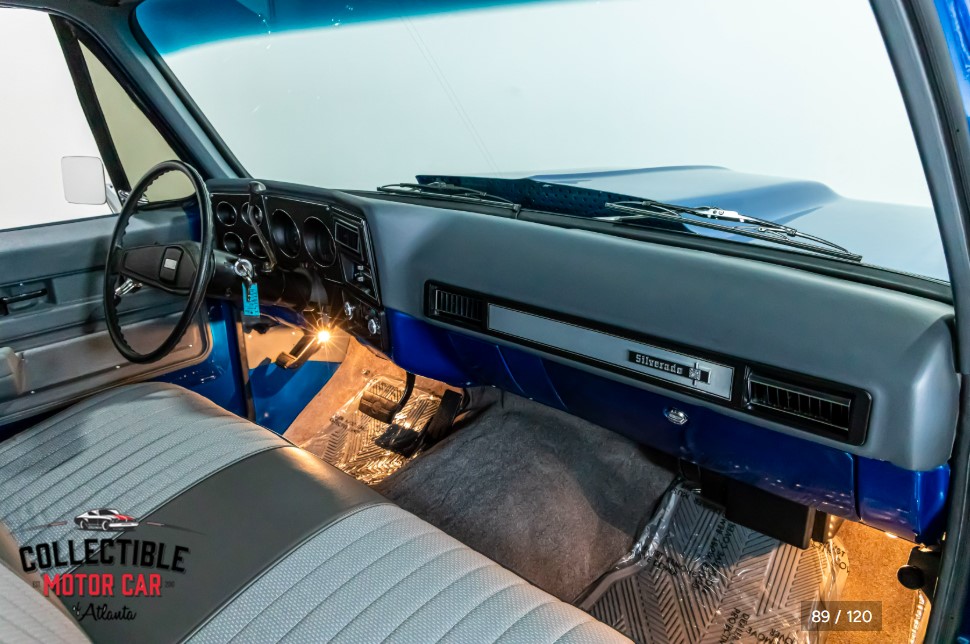 The exterior is what immediately sets this truck apart. Finished in a vibrant metallic blue with gray accent panels, it has a bold custom look while still respecting the original lines of the truck. The paint lays well in the photos, with strong gloss and good contrast between the two colors. Chrome trim and brightwork help tie everything together, while the classic square-body grille and front-end styling keep the truck unmistakably Chevrolet.
