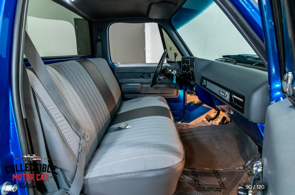 The dash retains the classic square-body layout, and the instrument panel, trim, door panels, and steering wheel all work together to give the truck a clean, finished appearance. The photos also show a fresh-looking headliner, clean painted metal surfaces, and good overall interior presentation.