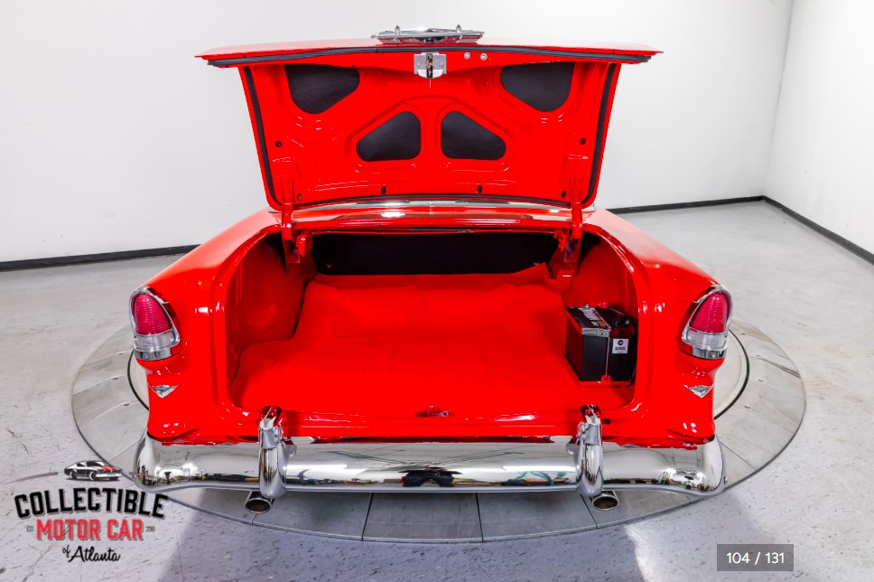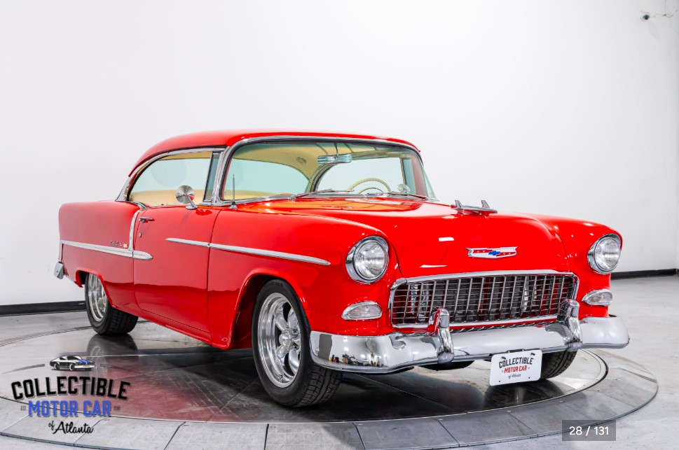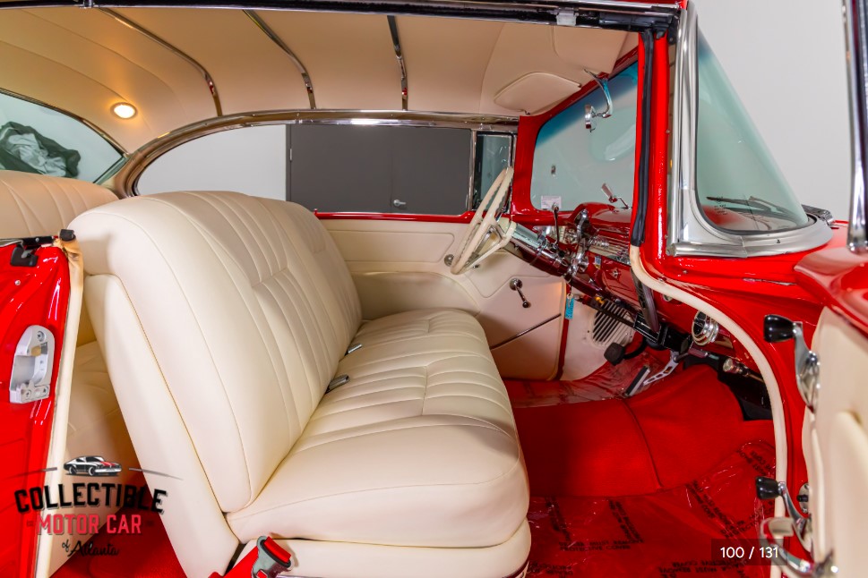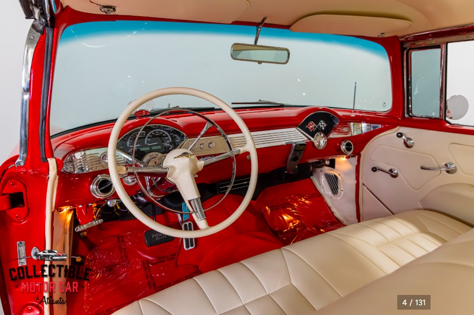 This example is listed as a Chevrolet 210 with Bel Air badging, giving it the clean side profile and iconic mid-'50s Chevrolet presence that buyers are always drawn to. The chrome and brightwork stand out nicely against the red paint, and the car has clearly benefitted from significant restoration and detailing throughout the build.