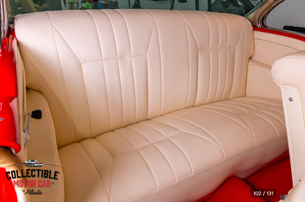 Inside, the cabin is finished in a clean and classic White leather-like interior that contrasts beautifully with the red exterior and red painted dash. The seat upholstery, door panels, headliner, and trim all present with a fresh, restored appearance, and the overall look is bright, clean, and inviting.